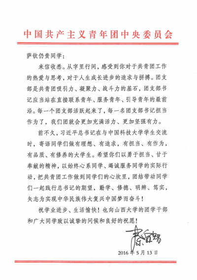 值五四表彰之际,山西大学迎来了一则重磅喜讯。山西大学2014级法学专业团支部书记萨钦仍贵同学围绕基层团支部工作心得与体会而写的一封信,收到了团中央书记处第一书记秦宜智的回信。