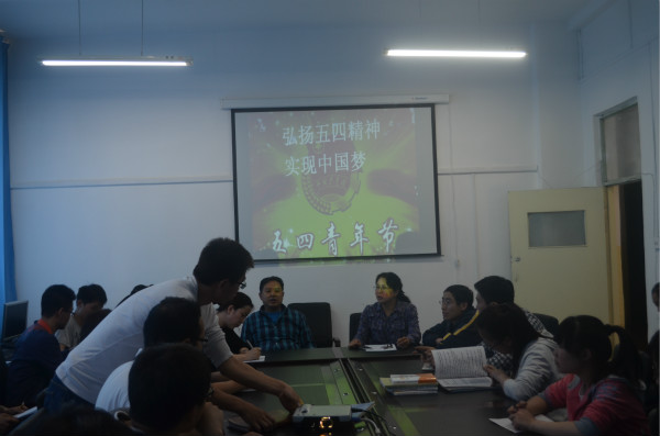首先由系主任薛太林教授致辞,他代表全体教师向到会的学生们表示节日祝贺,希望同学们作为干部,党员,一定要明白责任的分量,踏实积极的完成各项工作。系分团委书记么丽平对团委学生会的各项工作做了详细的安排。系总支副书记、副主任李长洪安排了五月下旬学生党员示范岗的表彰工作,提出加强监督检查事项。最后系总支李俊洁书记对五四精神进行了阐释,带领学生们学习了新时期党和国家以及总书记对青年的期待和要求,号召学生党员和干部们注重专业学习、练就过硬本领;注重文明习惯、做好表率示范;注重道德培养、提高综合素质,要求全体学生干部和学生党员平时看的出来、关键时刻站的出来,发挥示范和引领作用,影响和带动身边广大青年学生树立良好学风、系风。