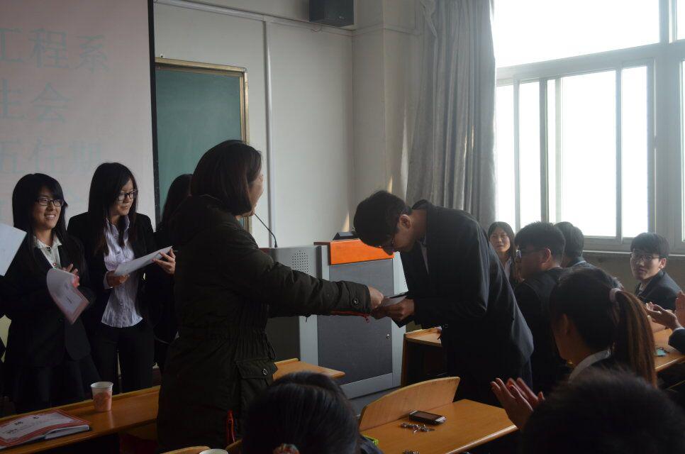 接下来由系团委书记为前任干部颁发聘书,以此表达对其工作的肯定,同时宣读学生会新一届干部名单。随后由新任干部依次发表就职演说。最后由系团委书记对本次大会做了总结发言并表达了对新任干部的期望。