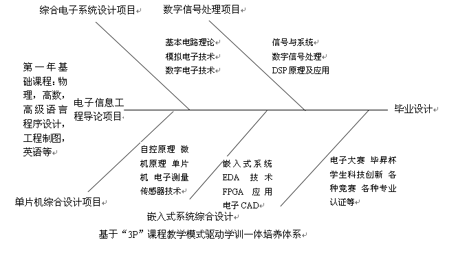 本专业教学计划在分析国内外现行本科培养模式和社会需求对本专业毕业生的要求与期望的基础上,明确了工业发展趋势对人才的要求和培养现代化工程师的目标。以培养计划为指导,形成了个人能力、人际能力及系统设计能力的培养理念,确定了以项目设计为导向、以“3P”教学模式为手段的综合培养方式,并制定了如鱼骨架图所示的本专业核心课程的培养结构。