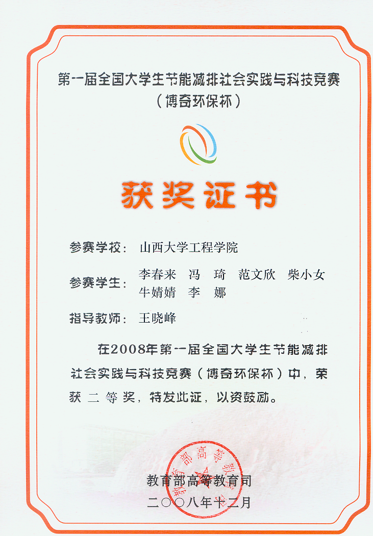 全国大学生节能减排社会实践与科技竞赛是由教育部高等教育司主办、唯一由高等教育司办公室主抓的全国大学生学科竞赛。 该竞赛充分体现了“节能减排、绿色能源”的主题,紧密围绕国家能源与环境政策,紧密结合国家重大需求,是一项具有导向性、示范性和群众性的全国大学生竞赛,得到了各省教育厅、各高校的高度重视。在2008年12月全国大学生节能减排科技作品大赛中,我系同学制作的《半导体温差发电装置与光伏电池装置综合设计》获国家级二等奖,为学校争得了荣誉。