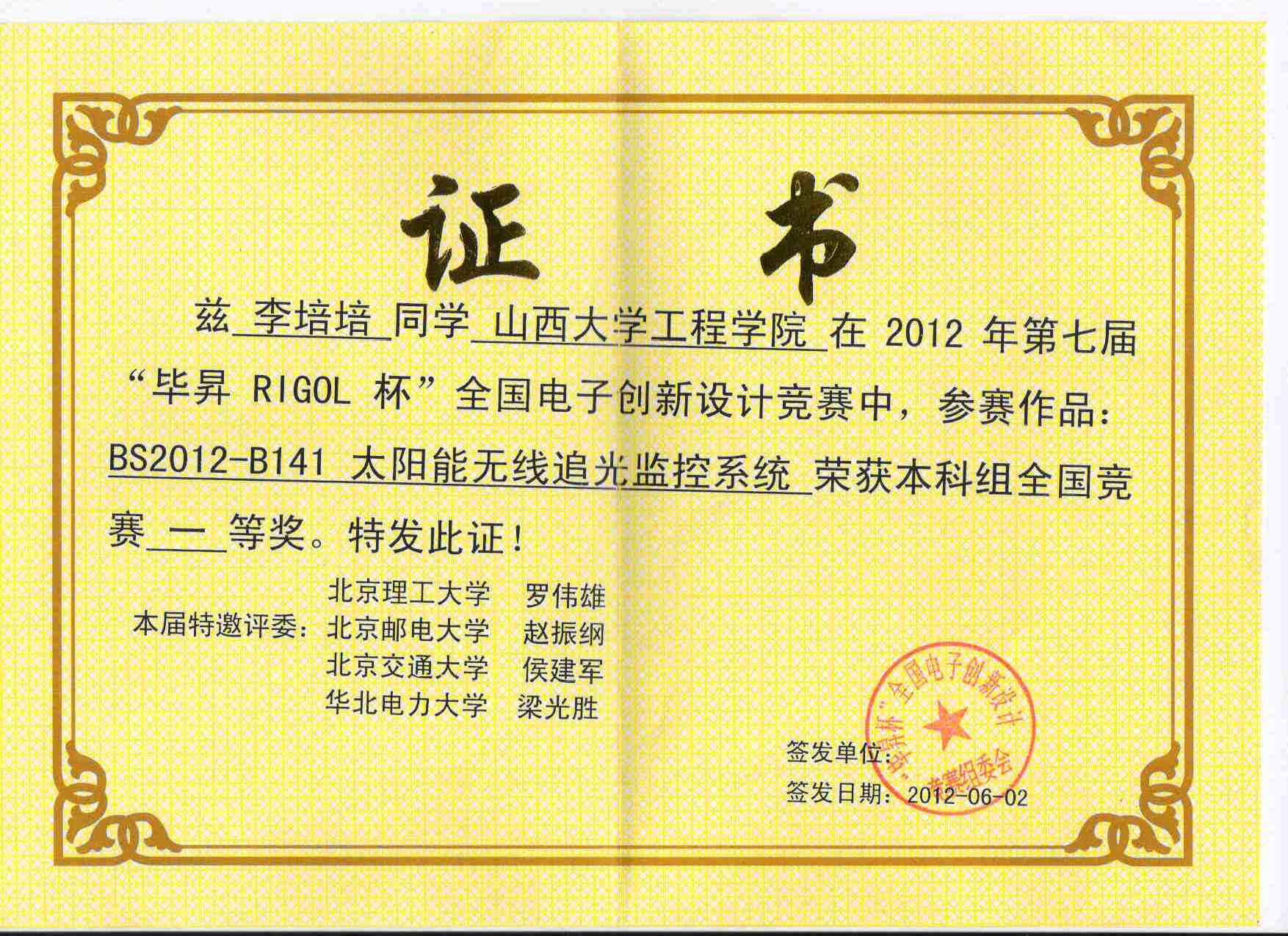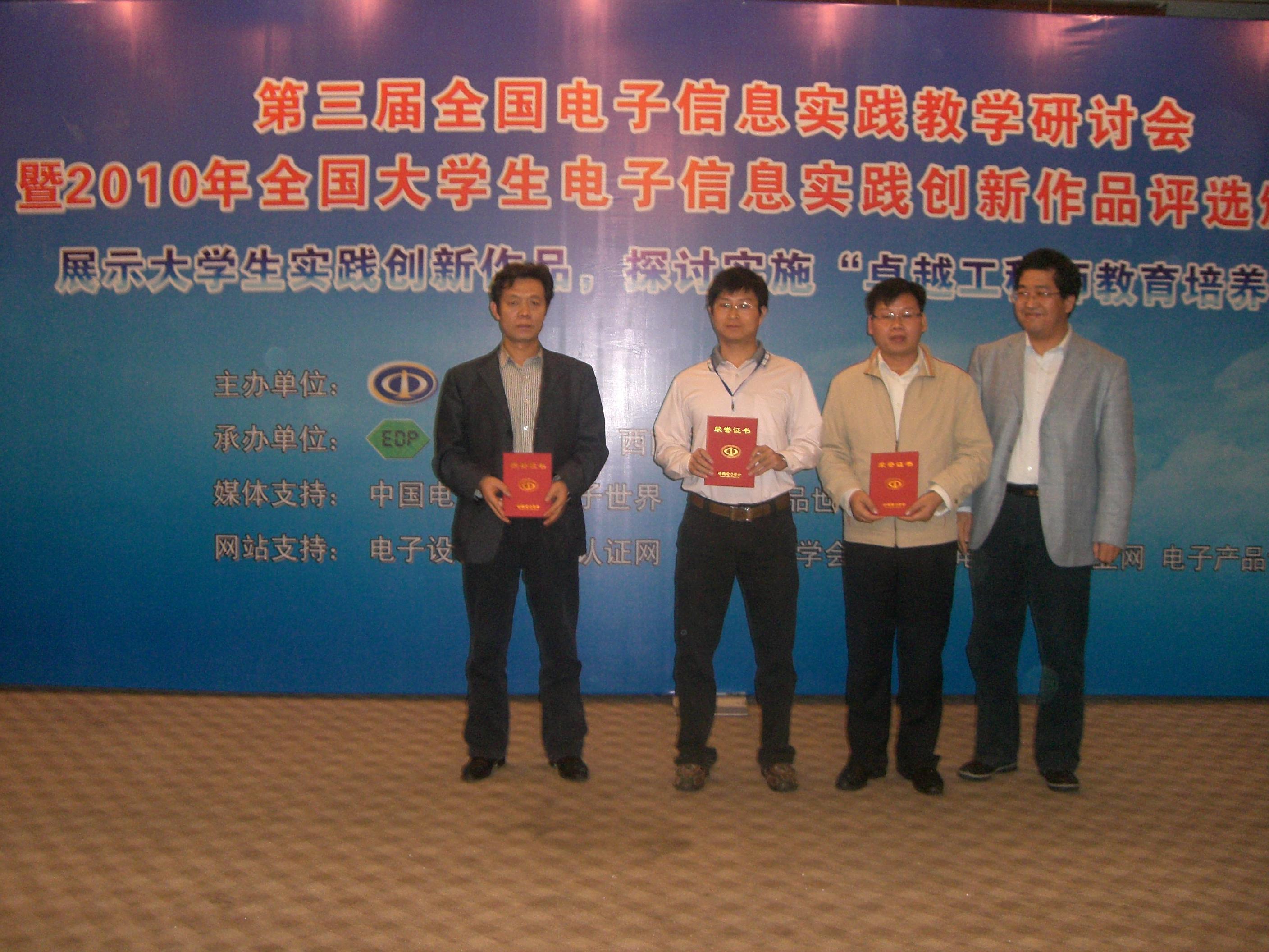 “毕昇杯”全国电子创新设计竞赛是面向全国高校在校生开展的电子创新型竞赛,旨在培养大学生的创新意识和实际动手能力,提高学生就业竞争能力,并为全国高校间的学术交流提供一个良好的平台。在2009~2013年度 “毕昇杯”全国电子创新设计竞赛中,我系同学制作的《智能节时无线控制交通网络模拟系统》获全国二等奖,特等奖一项、二等奖四项,为学校争得了荣誉。